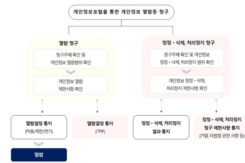 *서비스별 개인정보 열람청구는 개인정보보호위원회 개인정보보호 포털에 등록된 개인정보파일의 「개인정보파일 운용 및 열람등요구 처리부서」로 지정된 부서에서 처리합니다. | |